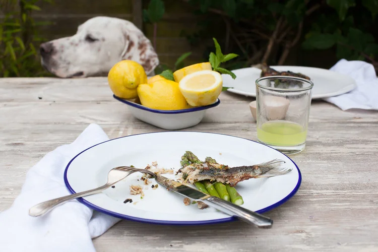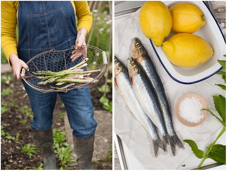 With a basket full of her delicious and fresh asparagus, I went to the local market for some sardines and lemons to create a little summer dish that incorporates my food philosophy of using seasonal produce with few ingredients and very little fuss.
