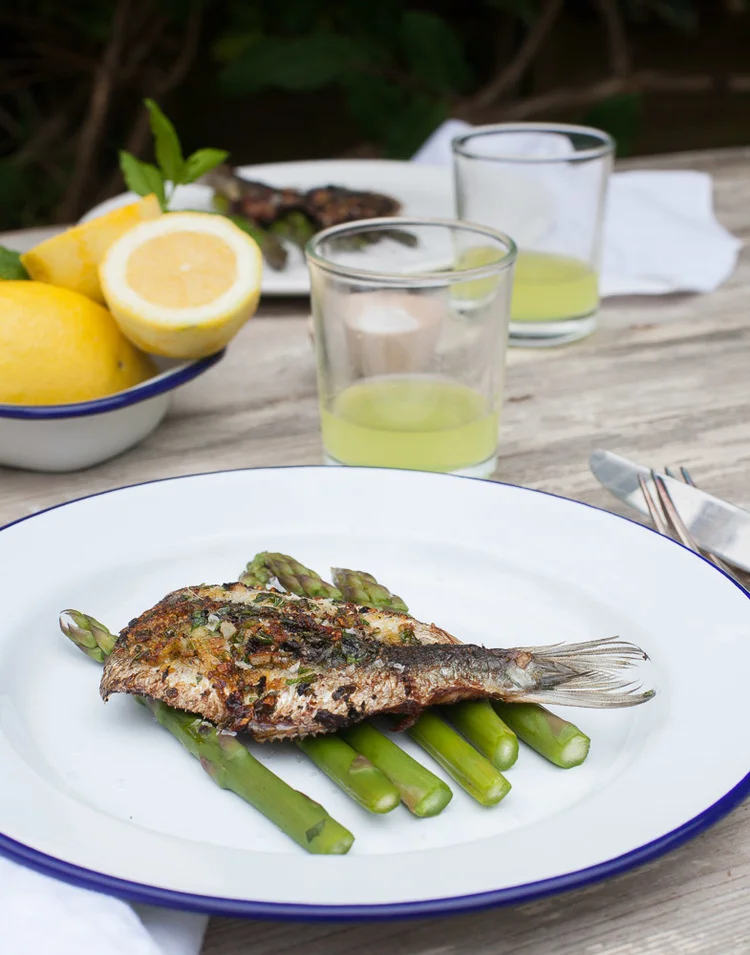 Serve the crisp sardines immediately on a bed of steamed asparagus with a drizzle of the marinade, a pinch of salt and a dash of lemon juice.